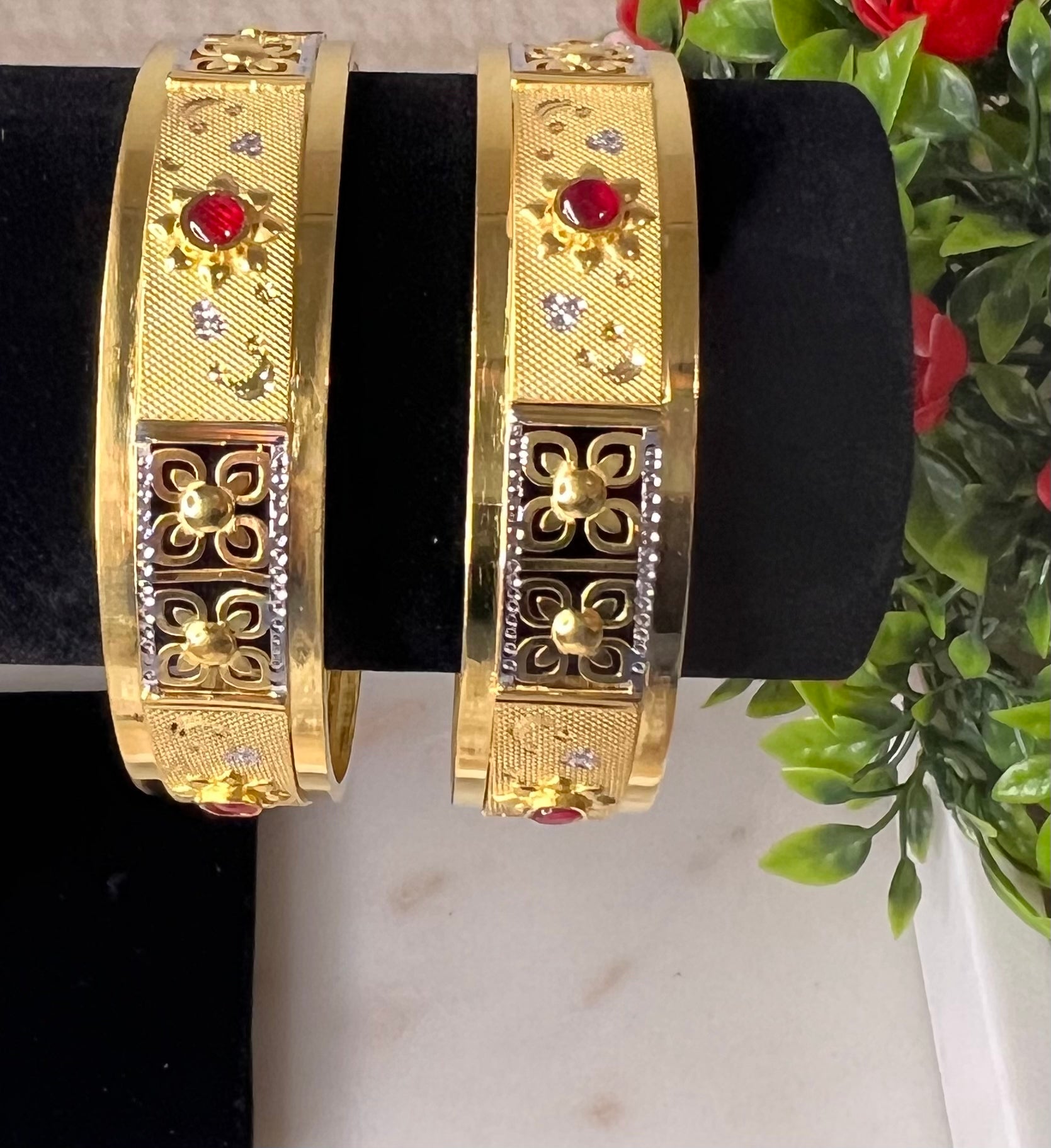 Crafted with meticulous attention to detail, this bangle boasts a wider rim, giving it a bold and distinctive presence. The gold look, rich and lustrous, wraps around your wrist, shimmering with every movement. Embedded within this golden canvas are radiant red beads, each one catching the light and adding a touch of fiery contrast to the bangle's design.